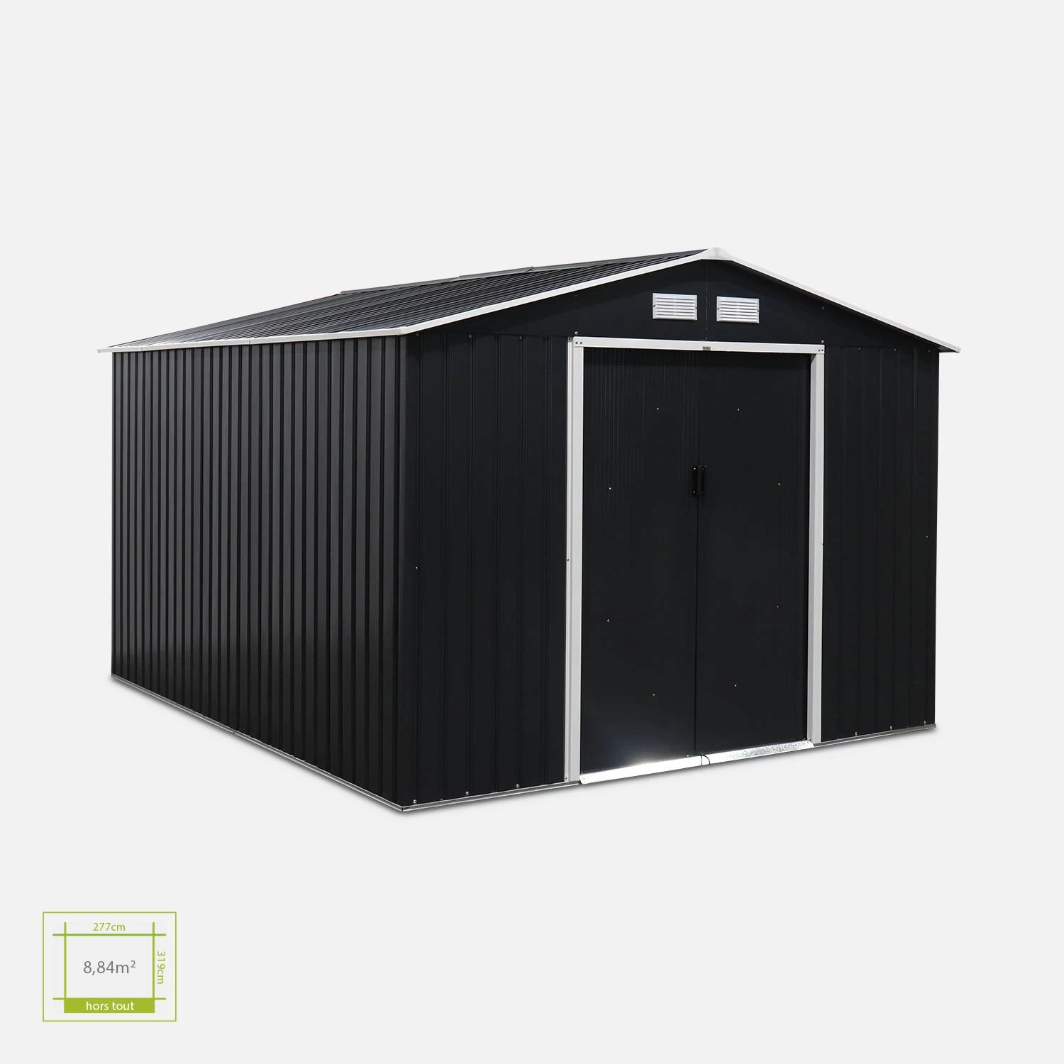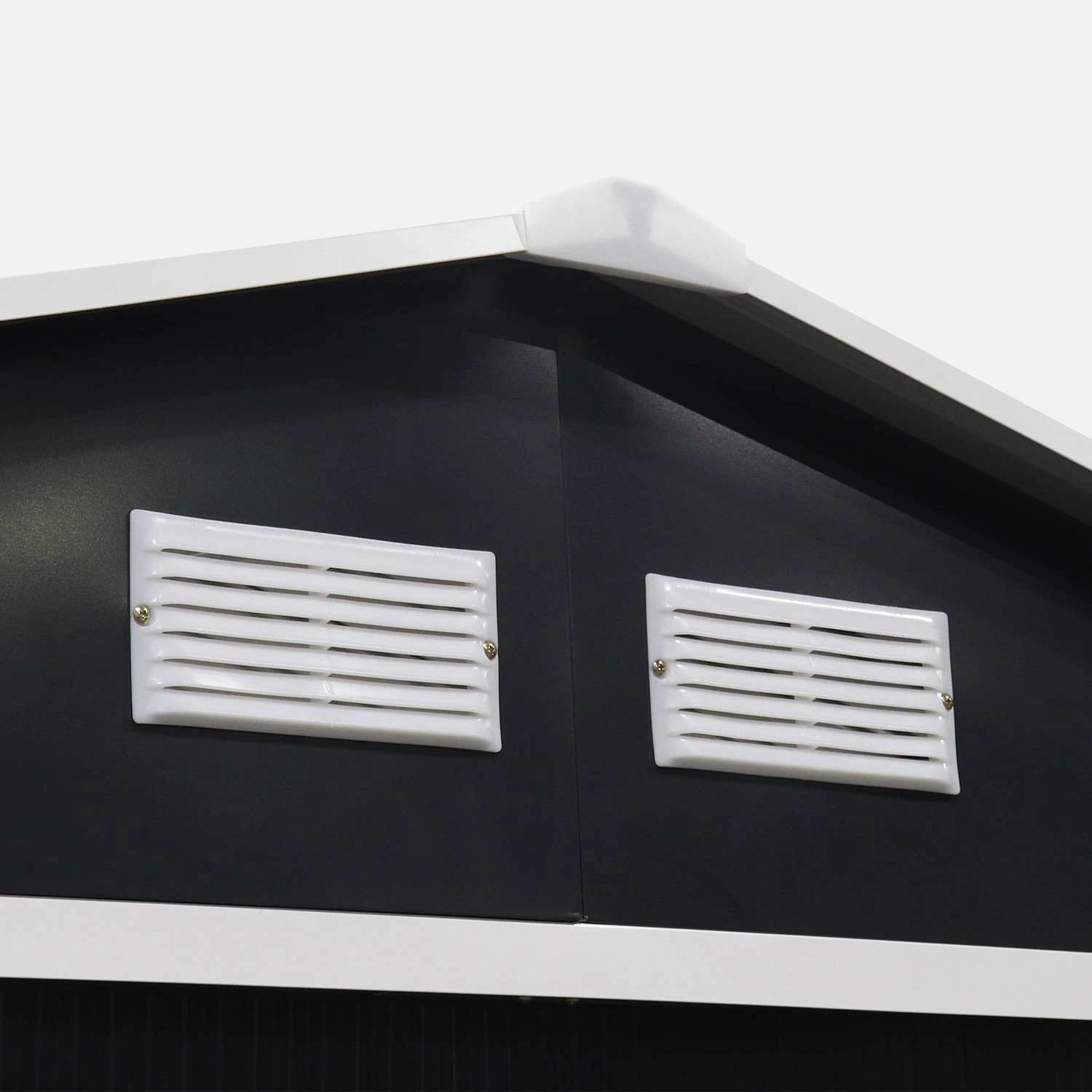 Cette maison de rangement est bien pensée. Elle est dotée d’une double porte coulissante pour ne pas perdre d’espace et faciliter le passage des outils. Les poignées peuvent, d’ailleurs, être liées par un cadenas (non fourni) pour sécuriser. Des grilles d’aération à l’avant et à l’arrière offrent une bonne ventilation et un peu de lumière dans l’abri. Le toit en pente, quant à lui, évite l’accumulation d’eau et de feuilles.