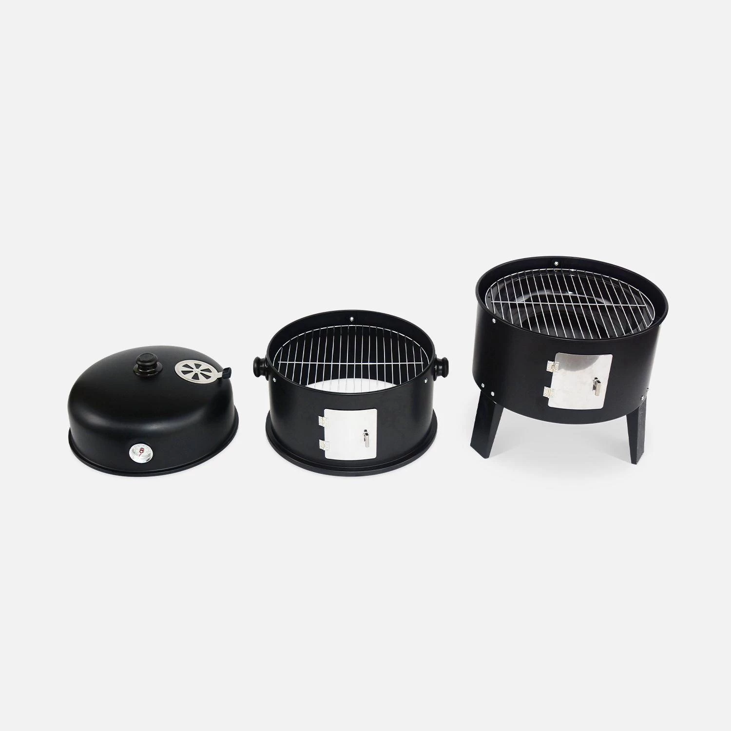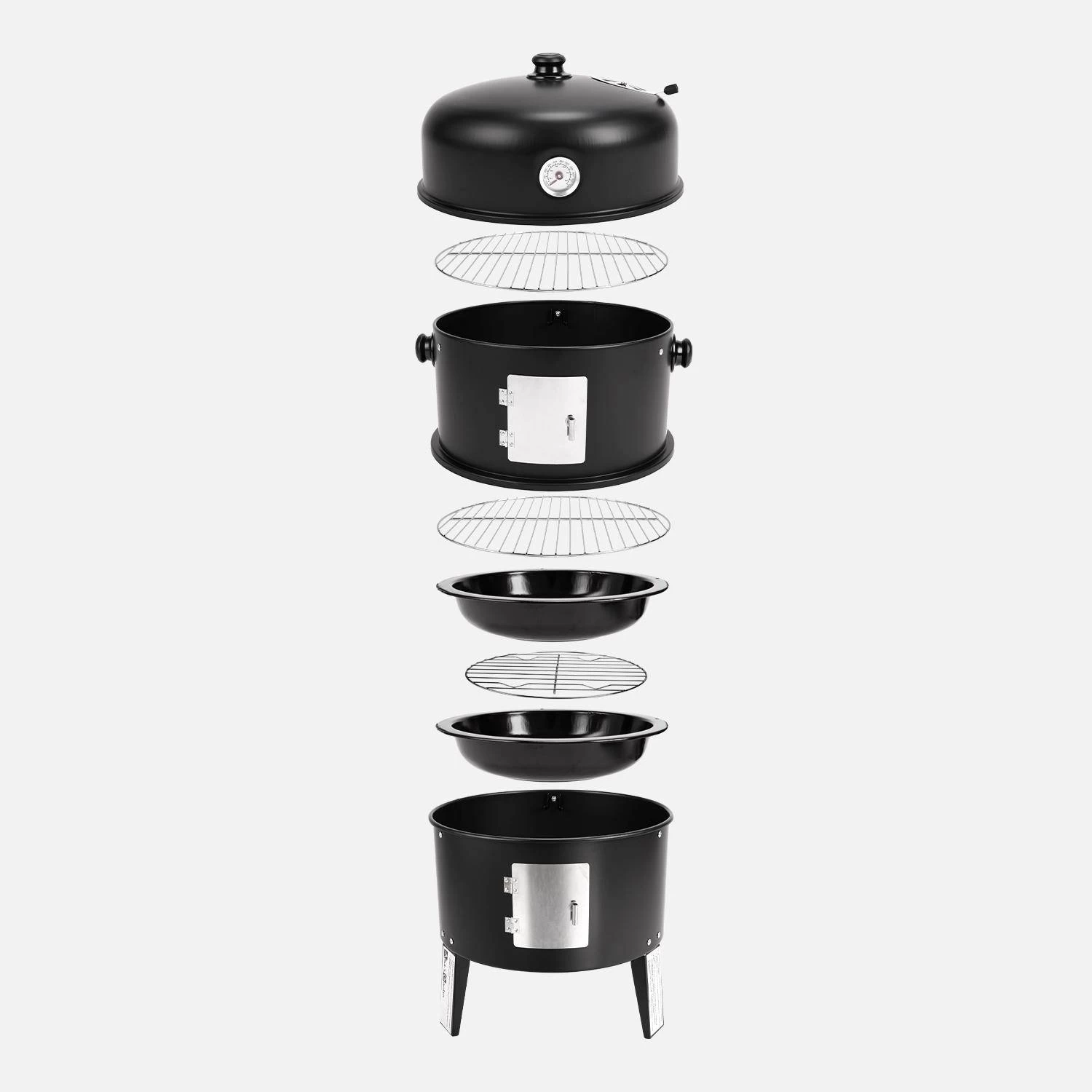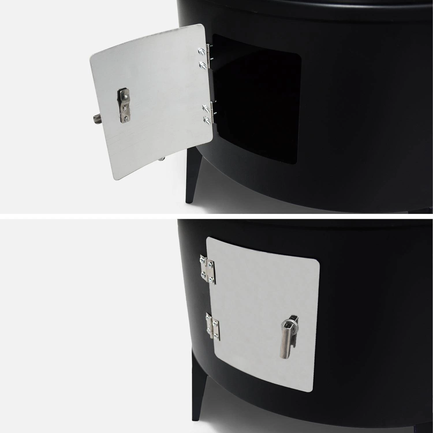Sur le côté se trouvent des portes qui permettent d’une part de rajouter du charbon de bois et du liquide de fumage, et d’autre part de limiter la perte de fumée. Des poignées sont placées sur le capot et la chambre de fumage afin de les manipuler aisément.