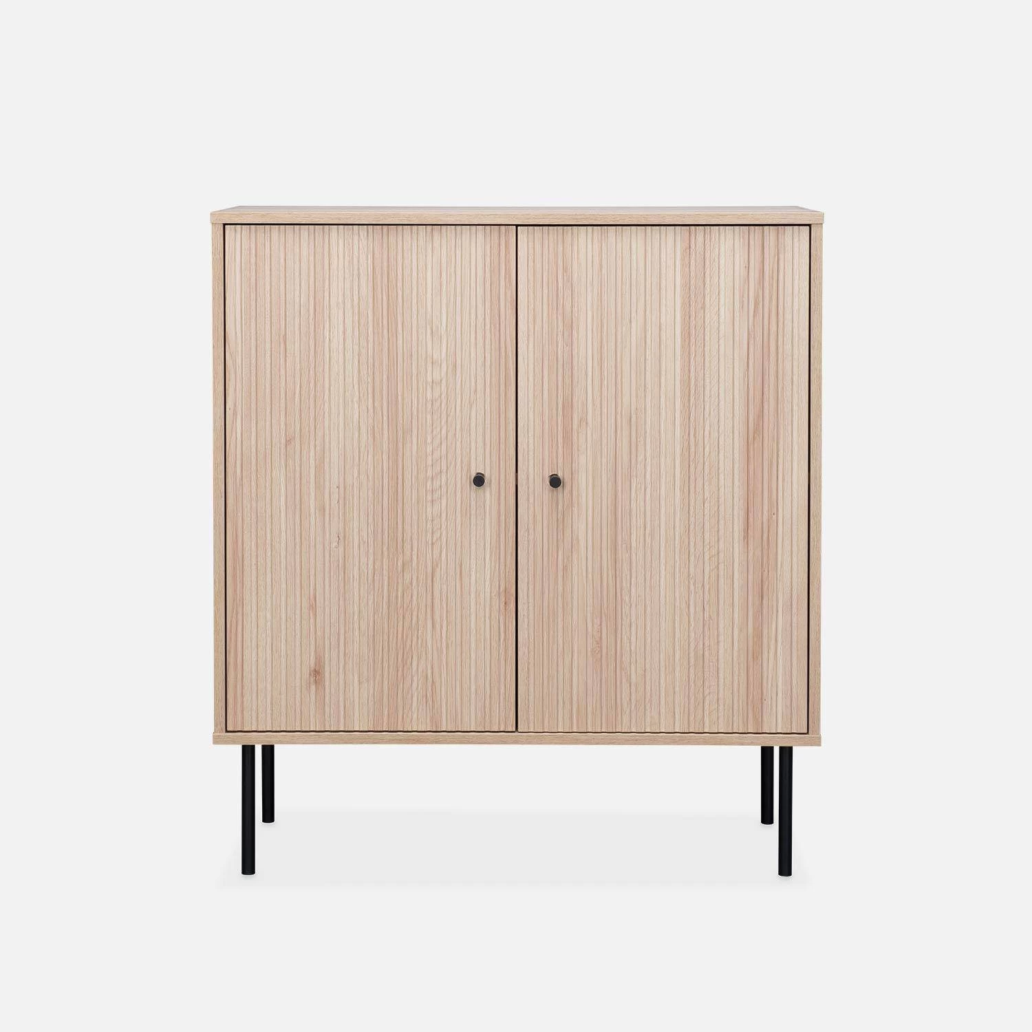 Ce buffet de rangement au décor bois rainuré et aux détails en métal noir mat est l’élément central qui permettra à votre intérieur de recevoir une touche contemporaine. Son design simple et élégant fera de lui un buffet qui s’adaptera à n’importe quelle décoration. N’hésitez pas également à ajouter quelques plantes sur son plateau afin d’apporter un peu de vert et de couleur à votre déco ! Le tout permettra de sublimer la couleur bois naturelle de votre meuble.