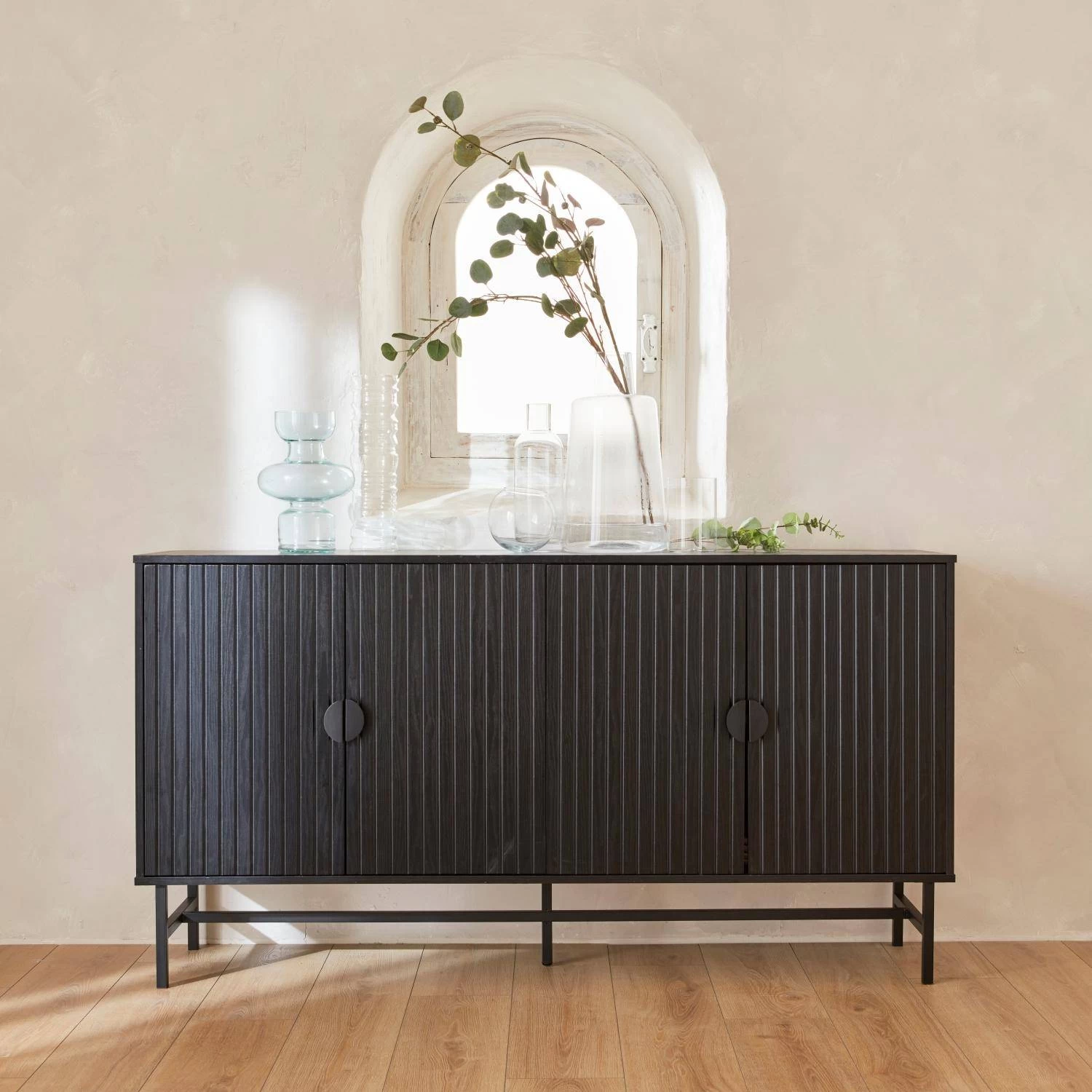 Très contemporain, ce buffet habillera votre intérieur avec tendance. Le décor bois rainuré est très élégant et fait tout le charme de ce meuble. Dotée d’une structure raffinée et de pieds fins en métal, il est léger et aérien.
