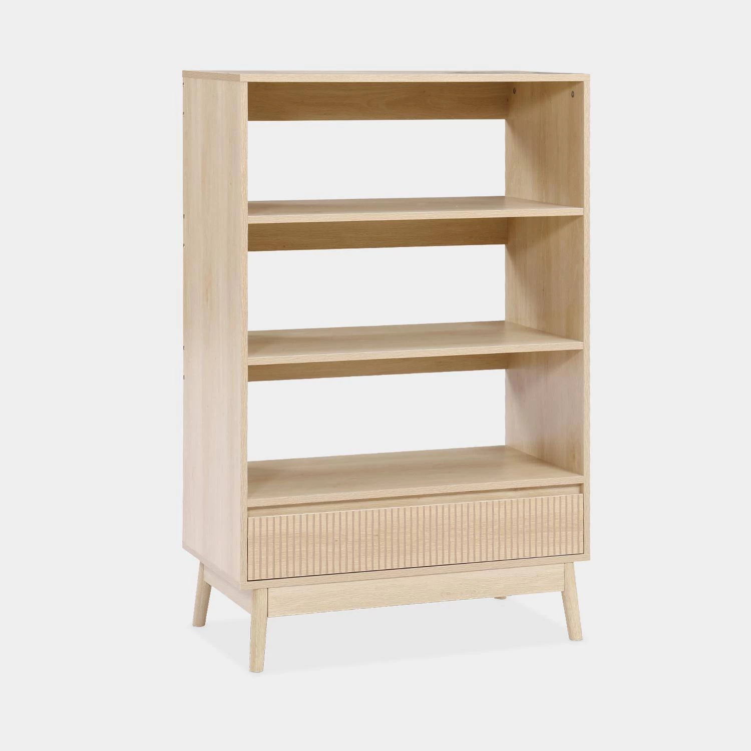 Dotée de 3 étages et d’un tiroir, cette bibliothèque vous offre un bel espace de rangement. Sur ses étagères, disposez vos objets déco favoris : cadres photo, bougies, figurines, petites plantes… Faites confiance à votre créativité ! Vous pouvez aussi décider d’y ranger votre jolie collection de livre. Dans son tiroir, rangez votre petit bazar à l’abri des regards.