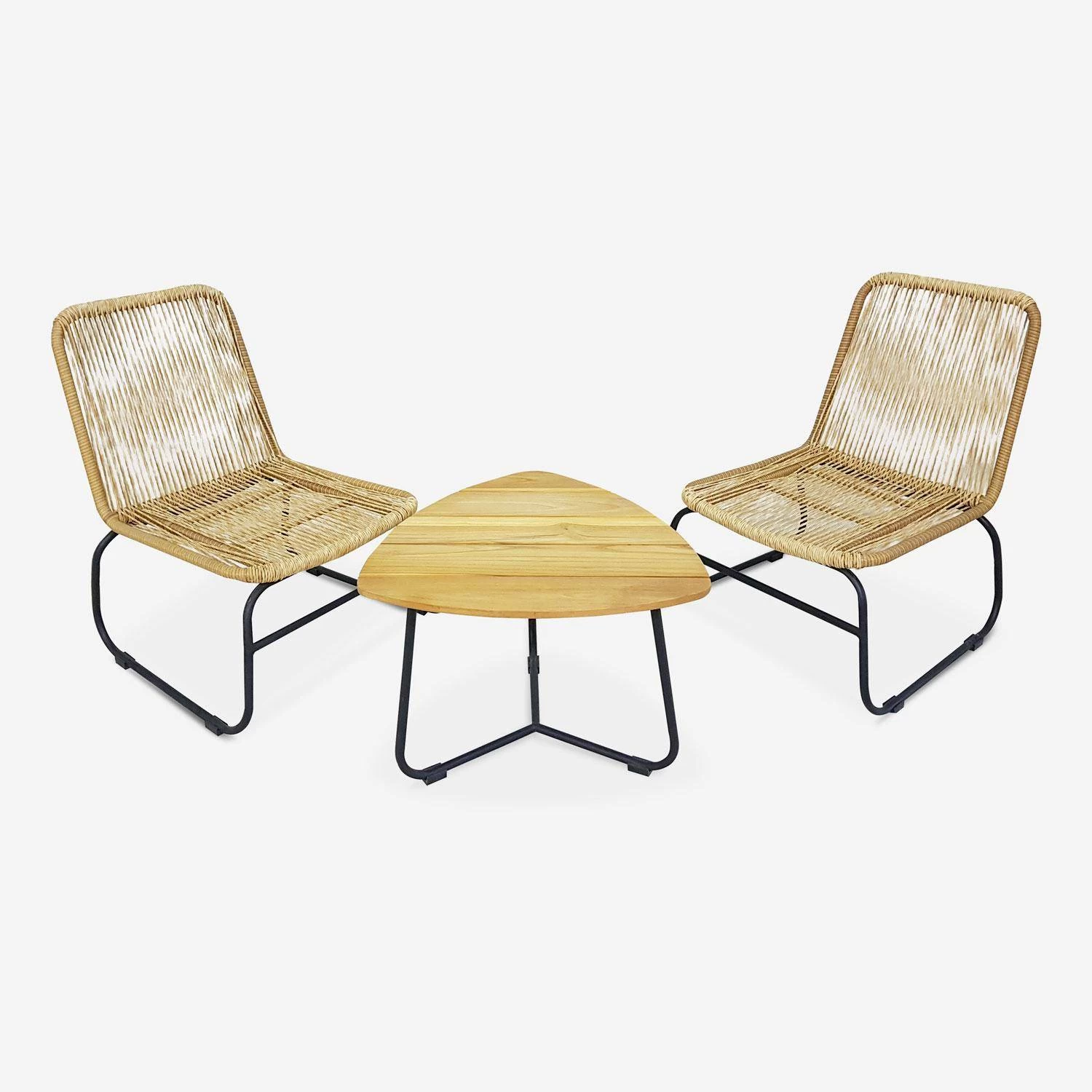 Parfait pour les balcons ou les petites terrasses, le salon de jardin Lombok est composé de 2 chaises et d’une table d’appoint. Avec un mix matières : résine tressée, bois et acier, ainsi qu’une table triangulaire, ce salon de jardin bas est résolument dans l’air du temps. Son style est minimaliste, ce qui lui permet de prendre place dans tous les environnements.