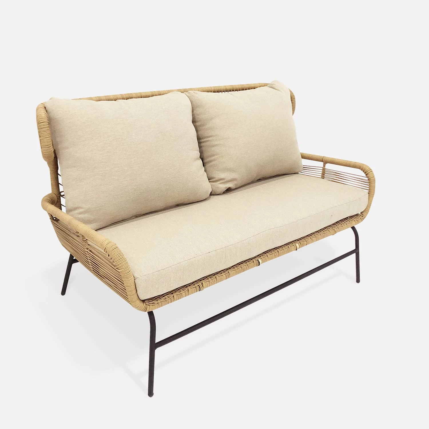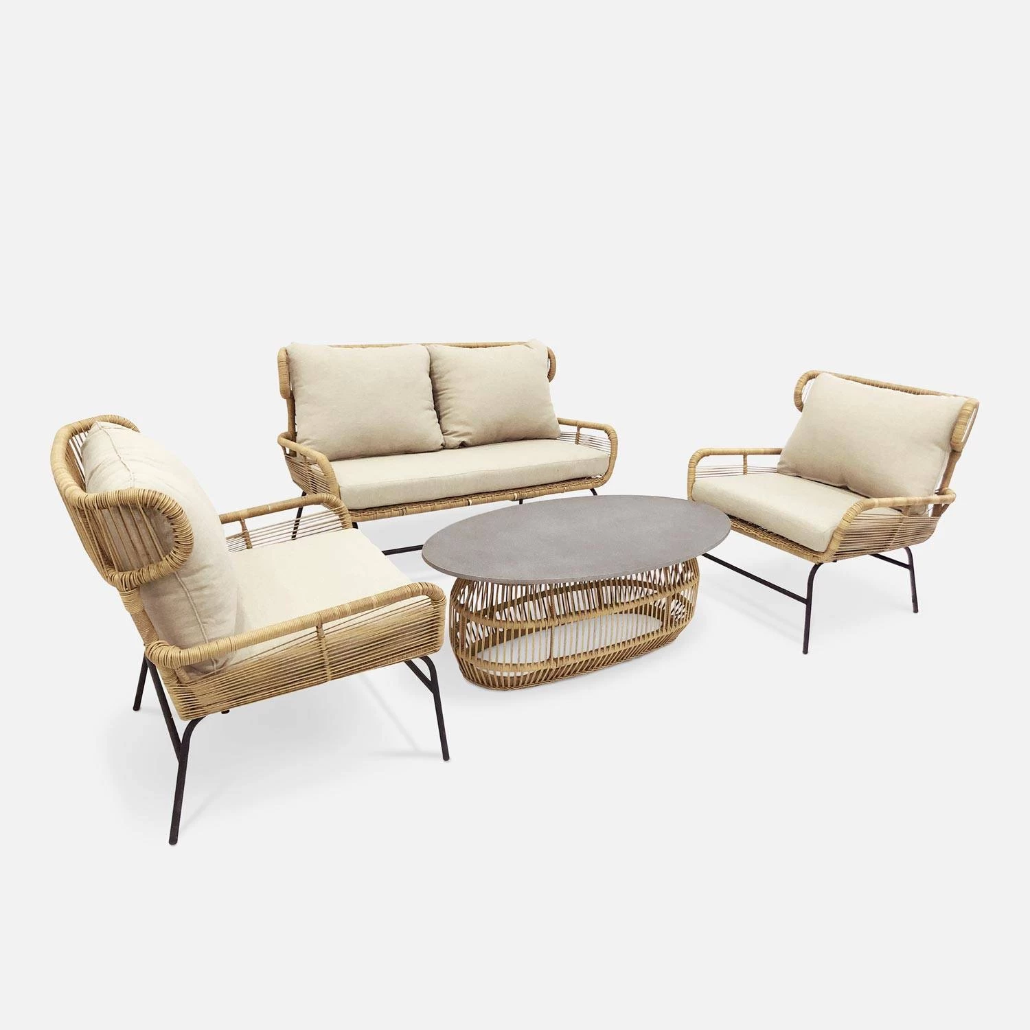 Fabriqué en résine tressée effet bambou, le salon de jardin bas Bali a un style très naturel. Son mix matière résine / fibre de ciment est résolument son atout charme. C’est ce qui lui donne, d’ailleurs, son côté tendance. Il est composé d’un canapé 2 places, de 2 fauteuils et d’une table ovale pour accueillir confortablement 4 personnes pour des moments de détente et de convivialité. Les coussins sont, d’ailleurs, épais de 9cm.