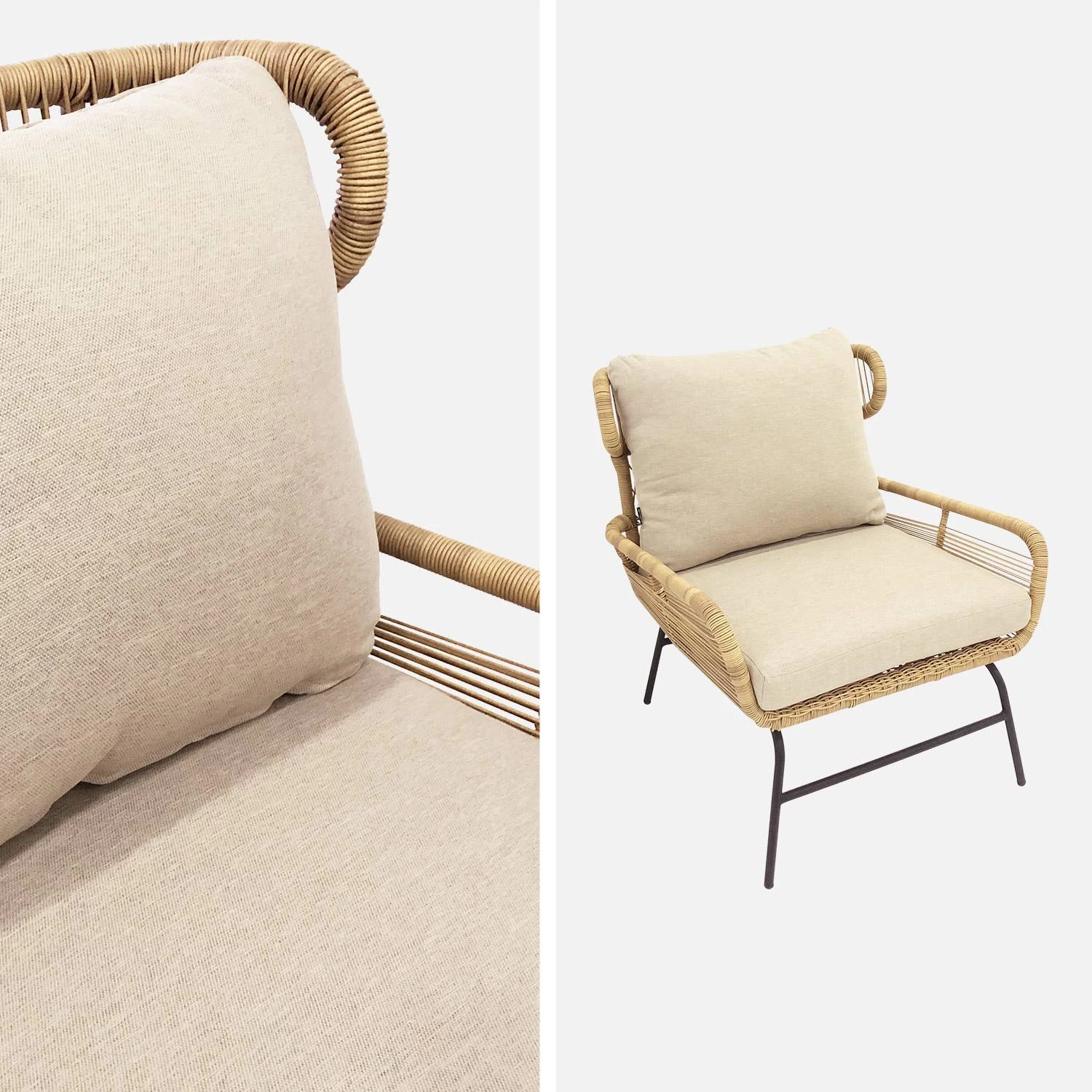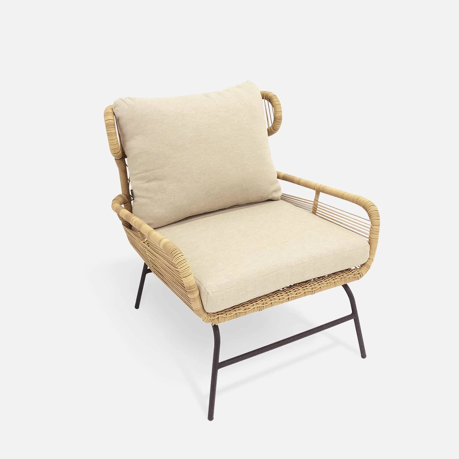 La résine tressée est un matériau qui résiste aux UV et aux intempéries. La structure des tables et des assises est en aluminium et les pieds des fauteuils et du canapé sont en acier. Cet ensemble est donc léger et robuste. Les coussins, quant à eux, sont déhoussables et en o. Plus précisément, la housse en Olefin est agréable au toucher et d’une densité de 250g/m².