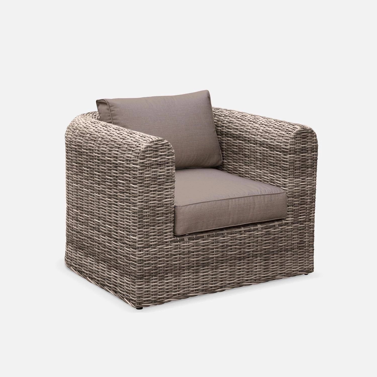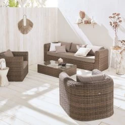 L’ensemble Juliano a un style très authentique car il est fabriqué en résine tressée arrondie. Ce matériau a l’aspect du rotin, mais n’en présente pas les inconvénients. Le tressage du Juliano est composé de 3 tailles de résine différentes (ø5mm, ø7mm et ø9mm) ce qui lui donne un style unique.