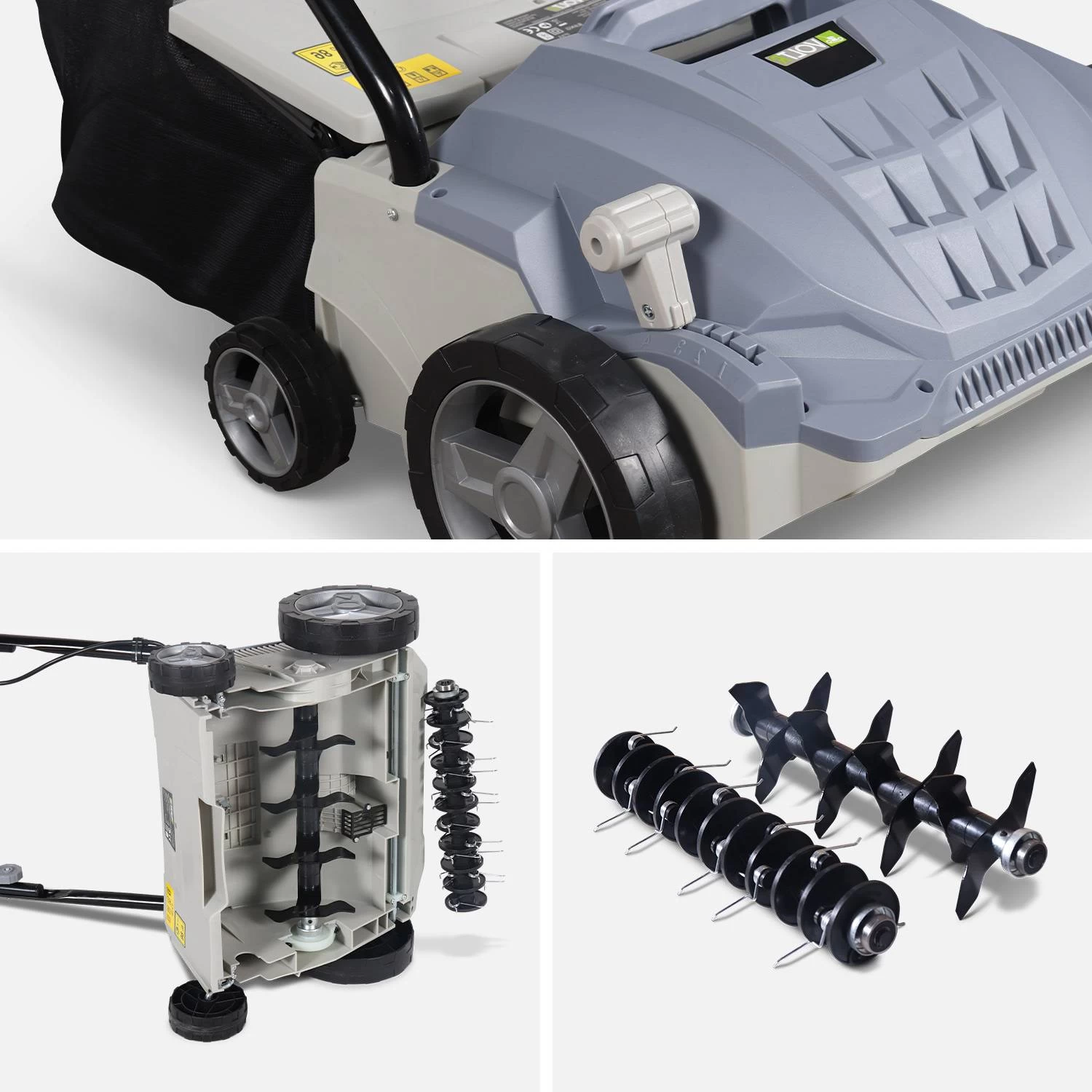 Le rouleau scarificateur à couteaux enlève la mousse à la base de la pelouse par lacération, et par extension tout le dépôt végétal gênant pour l’alimentation en eau et nutriments du gazon. Le rouleau à griffes, quant à lui, redresse l’herbe qui a été piétinée trop souvent et donc l’aère afin de la laisser pousser. Le scarificateur / aérateur a un moteur puissant de 1 500W et offre une largeur de travail de 32cm. Pour votre sécurité, pour mettre en marche le moteur il faut appuyer sur un bouton afin d’actionner la gâchette qui active le moteur.