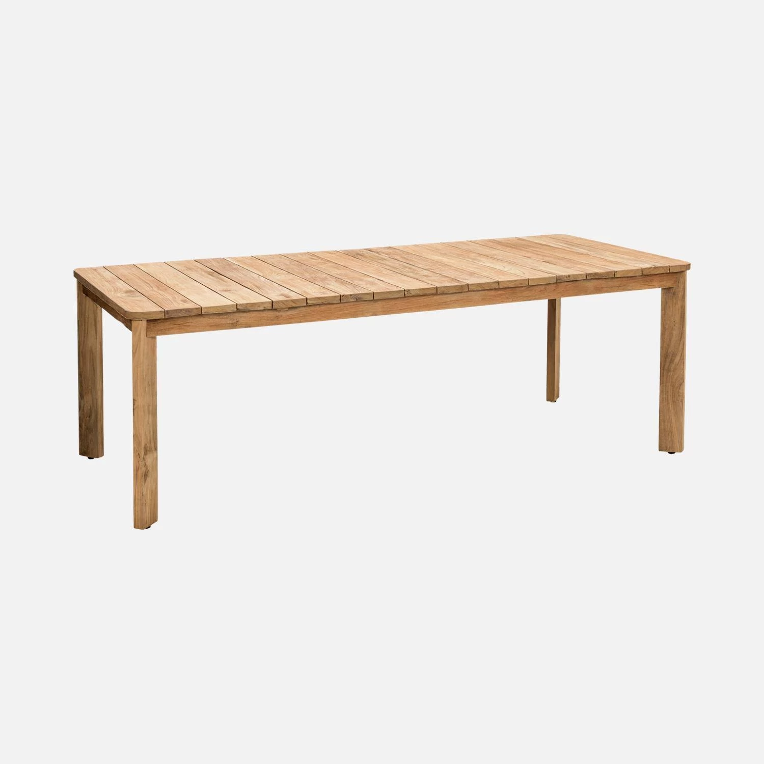 Le Teck est un bois tropical à croissance lente. Il faut 80 ans pour qu’un arbre arrive à maturité. C’est donc un bois rare et protégé. Le bois de teck est solide et très résistant. Bien entretenu, il peut conserver ses propriétés durant de très nombreuses années. Dans une démarche de préservation des forêts, le Teck recyclé est une alternative qui s’inscrit dans une démarche éco responsable. C’est un bois qui provient essentiellement de poutres, de bâtiments, de traverses de chemin de fer… Il permet d’éviter la coupe de milliers d’arbres chaque année. Le teck recyclé est retravaillé avant son utilisation pour la fabrication de meubles de jardin. Les trous sont rebouchés et le bois est poncé. Ces irrégularités témoignent de la vie passée du bois et révèlent toute la force et la durabilité de ce matériau. Ils rendent également chaque table en teck recyclé unique.