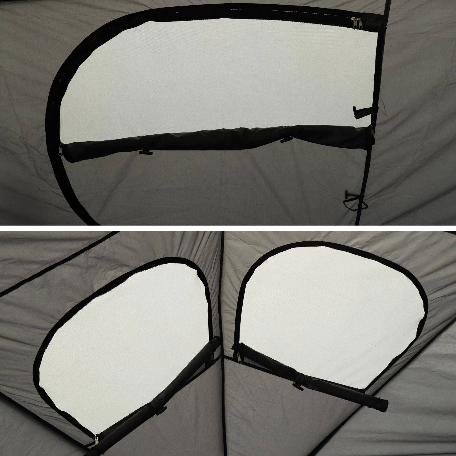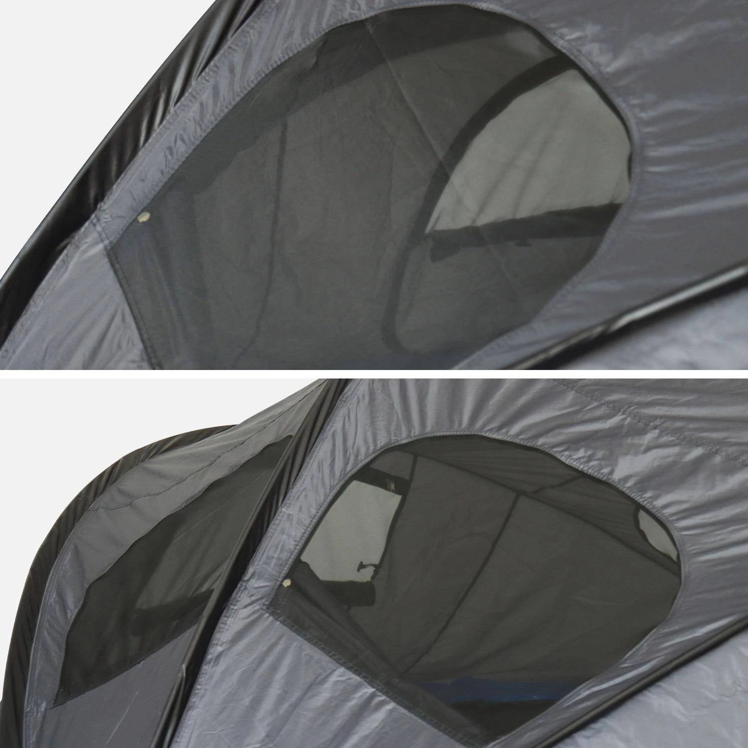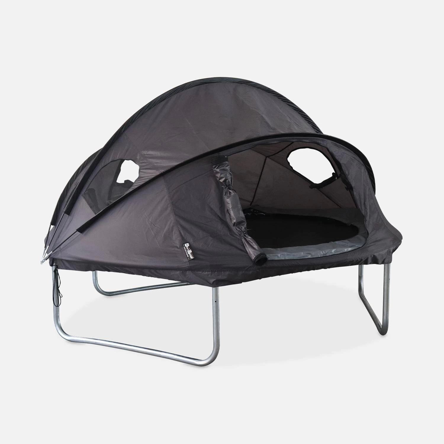 Transformez votre trampoline en cabane avec cette tente de trampoline qui permet à vos enfants de camper dans le jardin en toute sécurité (tente vendue sans le trampoline). Les parois en polyester sont traitées anti-UV pour que vos enfants puissent profiter de la tente tout en étant protégés du soleil. La tente est équipée de 2 portes et de 4 fenêtres qui s’ouvrent à l’aide de fermetures zippées et qui se fixent avec des velcros. Ces fenêtres permettent de réguler facilement la température à l’intérieur de la tente pour passer des nuits agréables à la belle étoile. Grâce à son sac de transport inclus, cette tente pour trampoline se range et se transporte facilement.