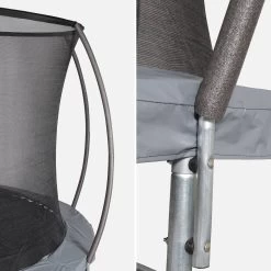 Le filet de sécurité, haut de 1,80m à partir du tapis de saut, sécurise l’utilisation et empêche les chutes hors du trampoline. Bien pensé, ce filet au maillage 6×6 millimètres est refermable avec des clips et une fermeture éclair. Cette dernière est jaune, pour vite repérer la sortie en cas d’urgence.