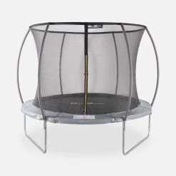 Le filet de sécurité, haut de 1,80m à partir du tapis de saut, sécurise l’utilisation et empêche les chutes hors du trampoline. Bien pensé, ce filet au maillage 6×6 millimètres est refermable avec une fermeture éclair. Cette dernière est jaune, pour vite repérer la sortie en cas d’urgence.