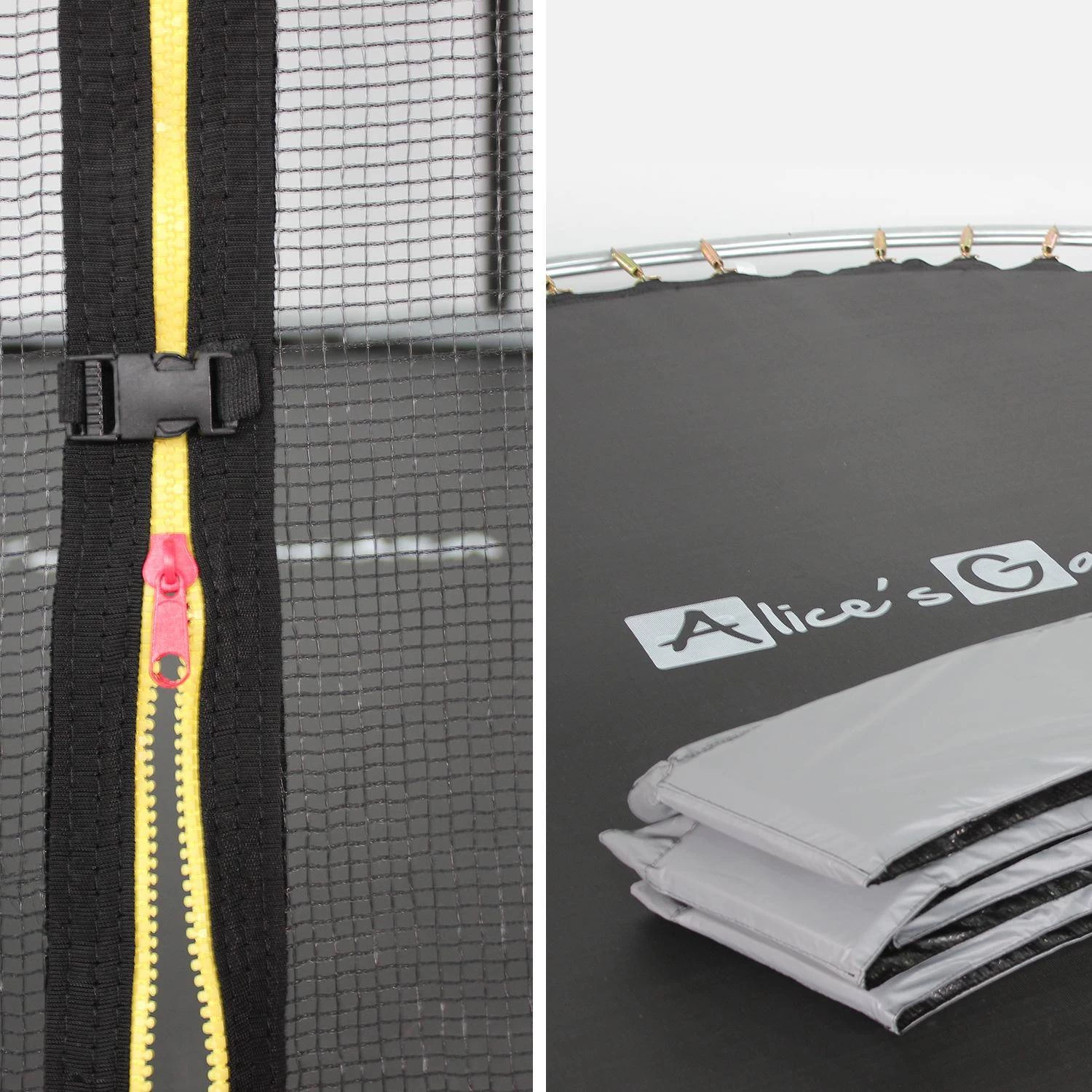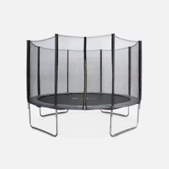 Le filet de sécurité, haut de 1,80m à partir du tapis de saut, sécurise l’utilisation et empêche les chutes hors du trampoline. Bien pensé, ce filet au maillage 6×6 millimètres est refermable avec des clips et une fermeture éclair. Cette dernière est jaune, pour vite repérer la sortie en cas d’urgence.