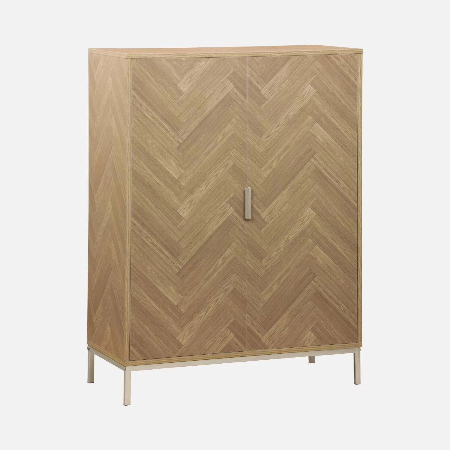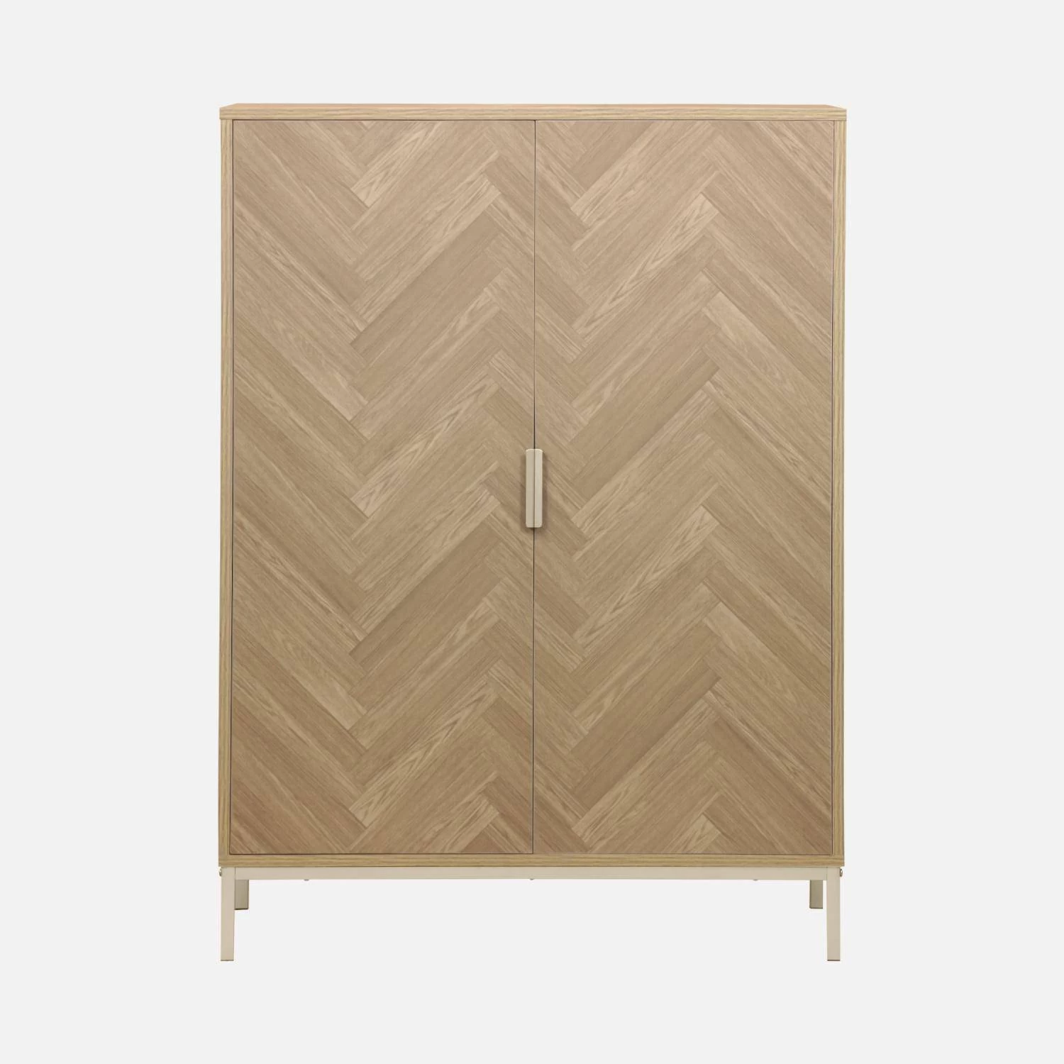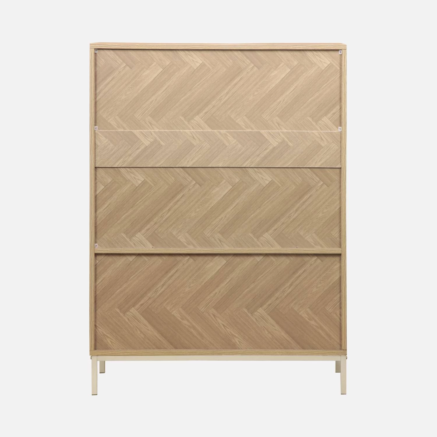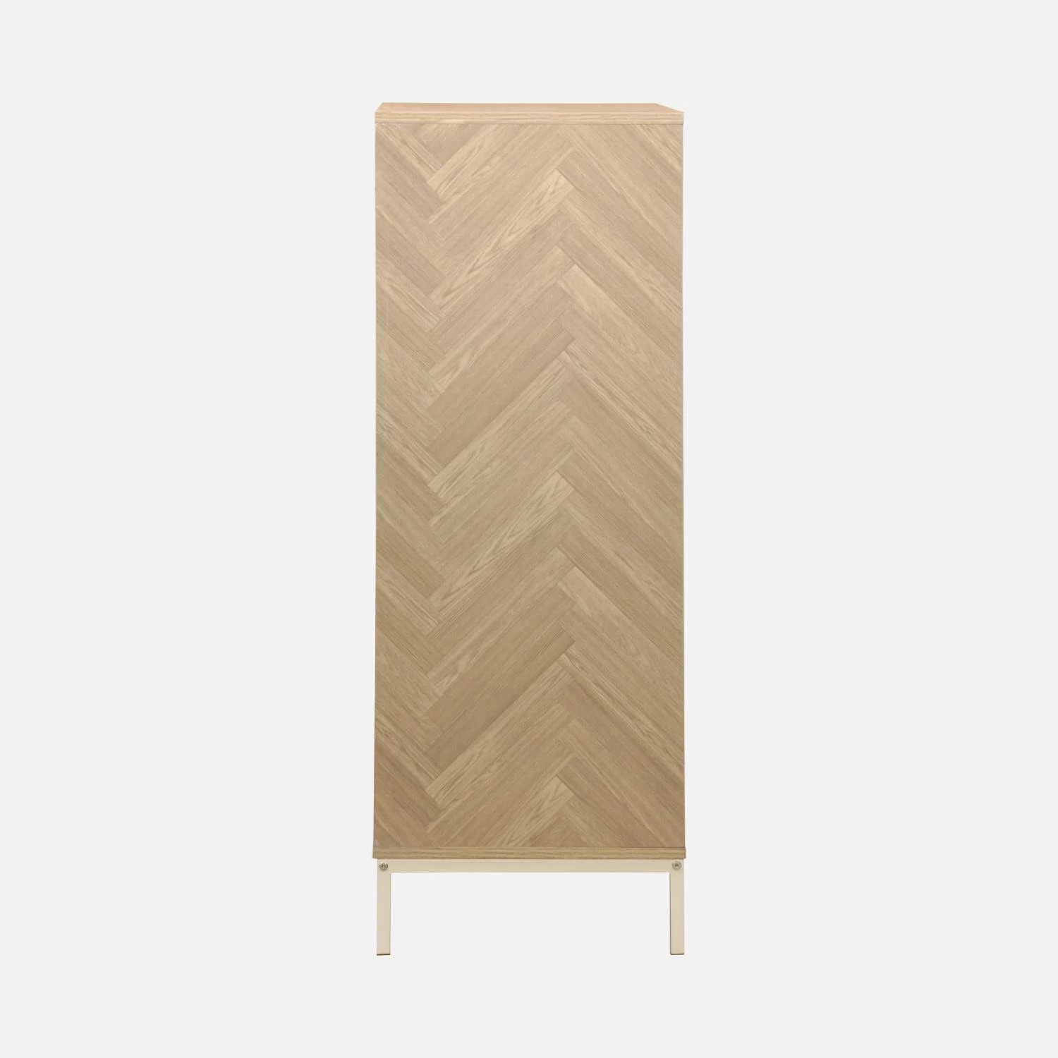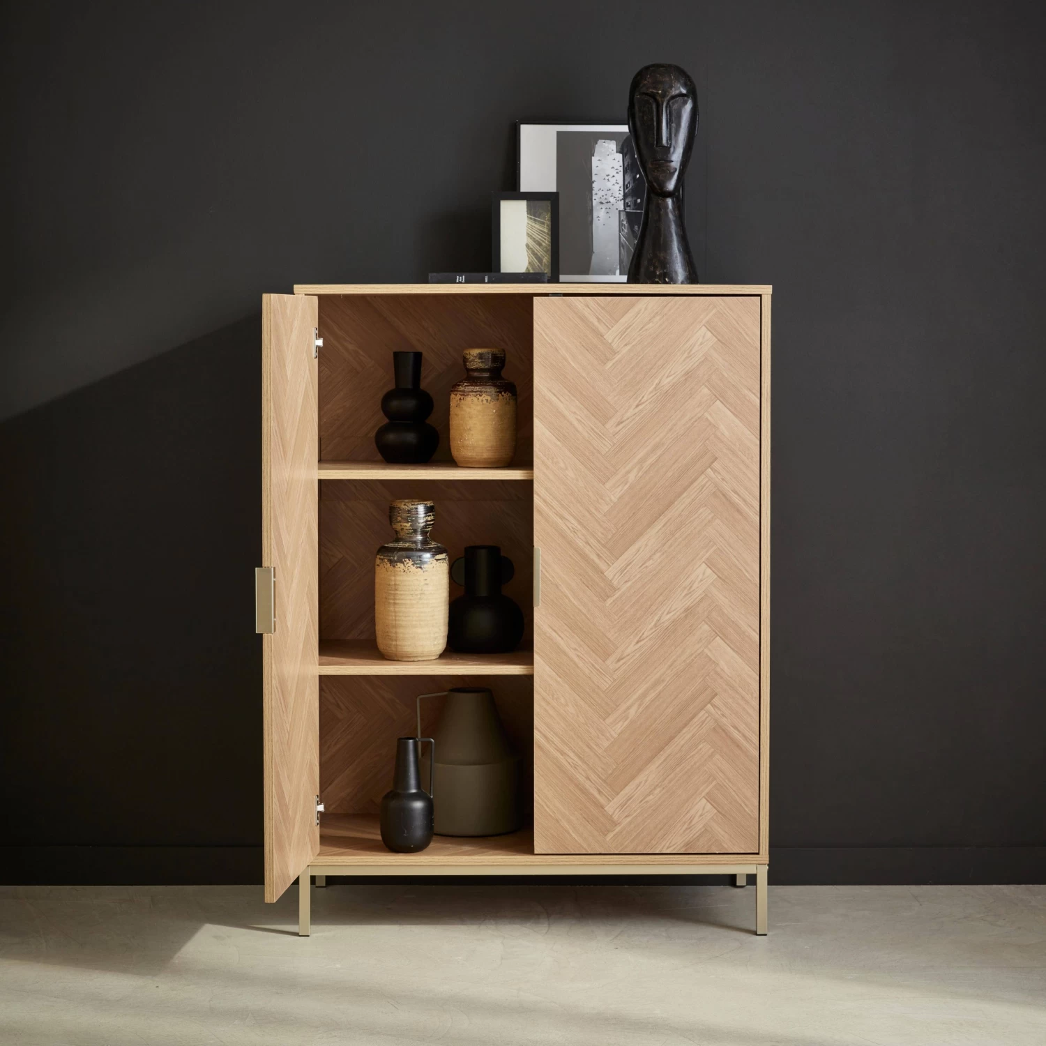 Ce vaisselier au décor chevrons s’inspire du parquet point de Hongrie très élégant. Son décor le rend particulièrement raffiné et élégant. Chic avec un design travaillé, ce meuble se plaira dans une décoration plutôt contemporaine. Pour compléter son design, ses pieds et ses poignées sont en métal couleur champagne pour encore plus de raffinement. Salle à manger, cuisine, ce vaisselier trouvera facilement sa place chez vous.