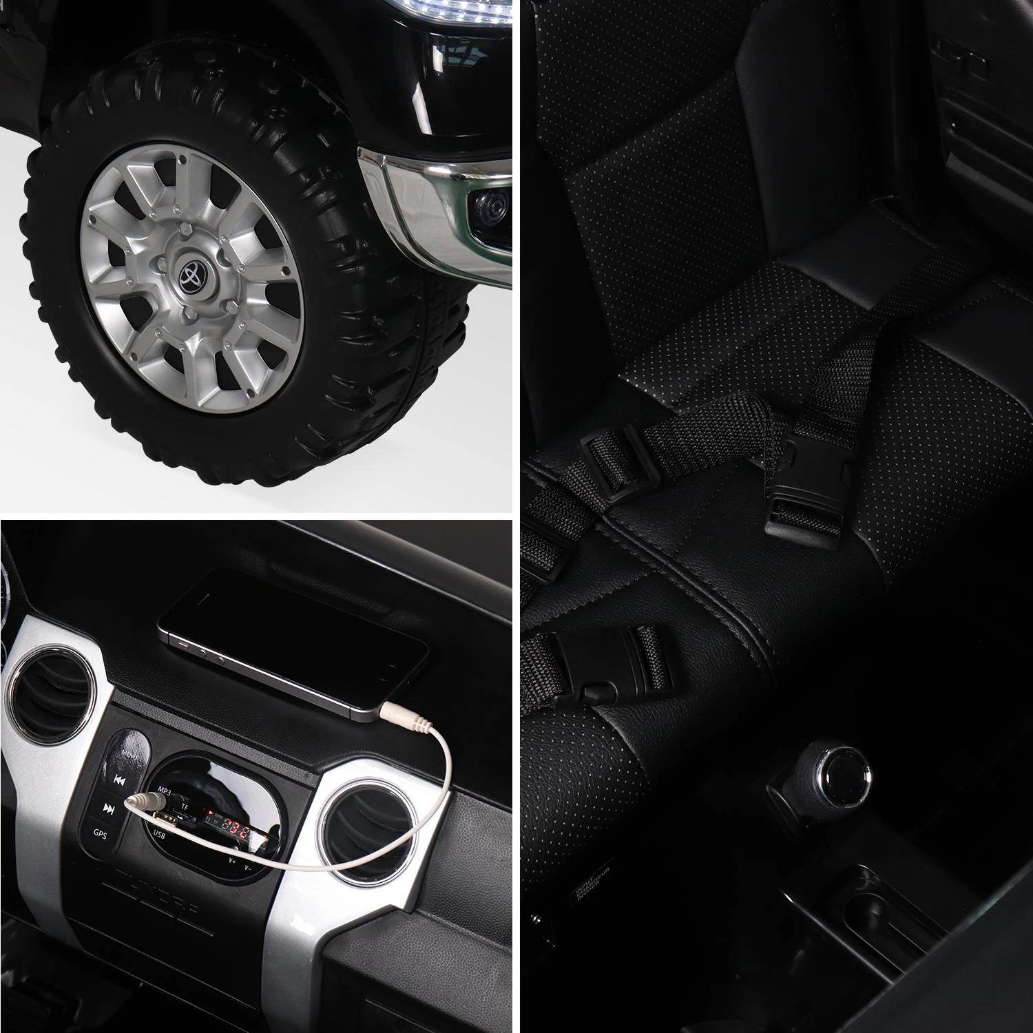 Qui n’a jamais rêvé d’un 4×4 Toyota Land Cruiser, Pick-up Hilux ou encore un RAV4 ? Cette voiture électrique pour enfants réunit tous ces modèles en un seul. Cette version, sous licence officielle Toyota, est plus large que la plupart des véhicules électriques car elle possède deux vrais sièges (en cuir !) pour accueillir deux enfants à son bord. Les moteurs et la capacité de la batterie ont été largement revus à la hausse pour offrir de meilleures performances et une meilleure autonomie. Dans cette voiture de leurs rêves, ils peuvent en effet : ouvrir les portes, s’installer à bord, boucler la ceinture de sécurité, démarrer le moteur, allumer l’autoradio et les phares, puis enfoncer la pédale d’accélérateur. Les apprentis pilotes vont s’en donner à cœur-joie.